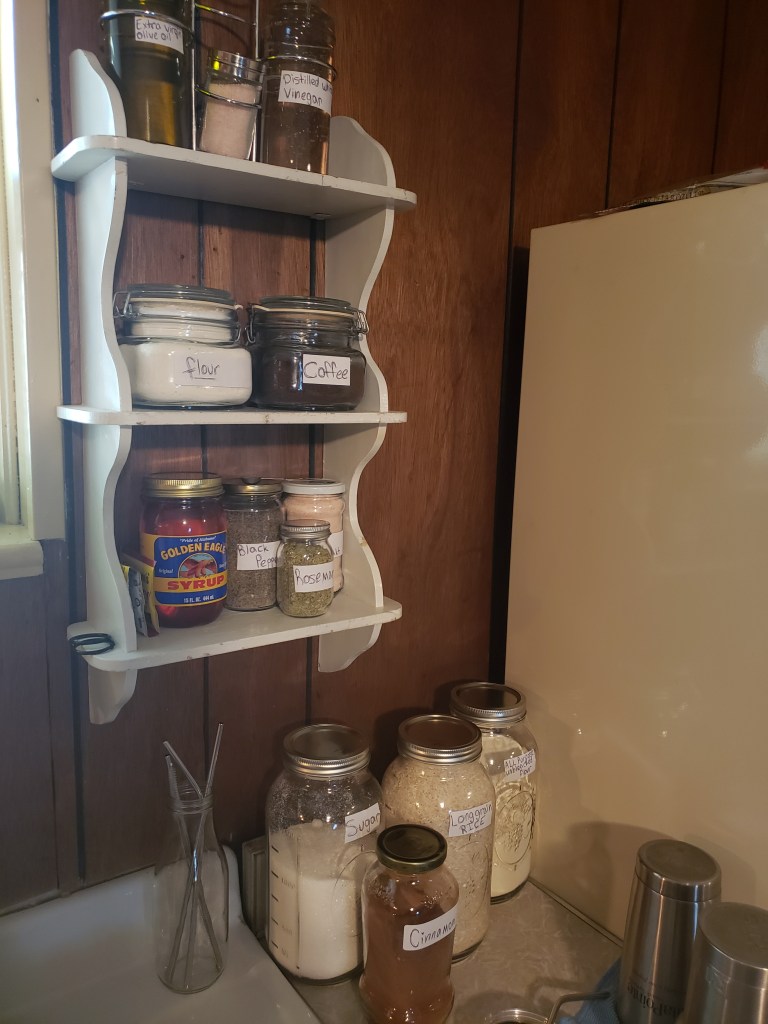 First, I established the aesthetic that brings me the most joy. My goal in life is to homestead so I want my home to reflect that cozy cabin, home-made feel. It makes me feel at peace and reminds me of my grandmother. I love handmade, sustainably sourced, and functional things. I store my herbs, spices, and baking materials in clear glass jars.